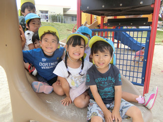 「みて~ここまで登れたよ。先生ものぼってきて」とクモの巣の形のロープを上まで登っていました。ブランコに乗りこいでもらったり、走ってまわりはしゃいでいた子どもたちです。休憩タイムでは、「あ~おいしい」といっぱい水を飲みしっかりと水分補給も♪